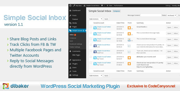 The Simple Social Inbox shows your messages from all your different social accounts in one easy to manage location. Let you and your staff manage posts/messages/replies from multiple Facebook Pages and Twitter accounts. This Premium WordPress plugins allows you to easily share content to your Social networks. There is also a link click tracking feature so you can see how many people clicked your Social shares.